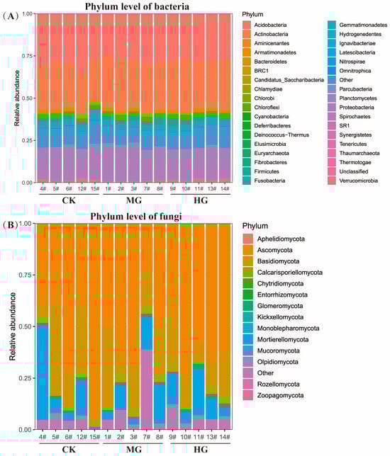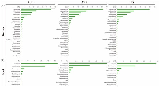 The compositions of soil bacteria (A) and fungi (B) at the phyla level among different grazing intensities. Null grazing, CK; moderate grazing, MG; and heavy grazing, HG.