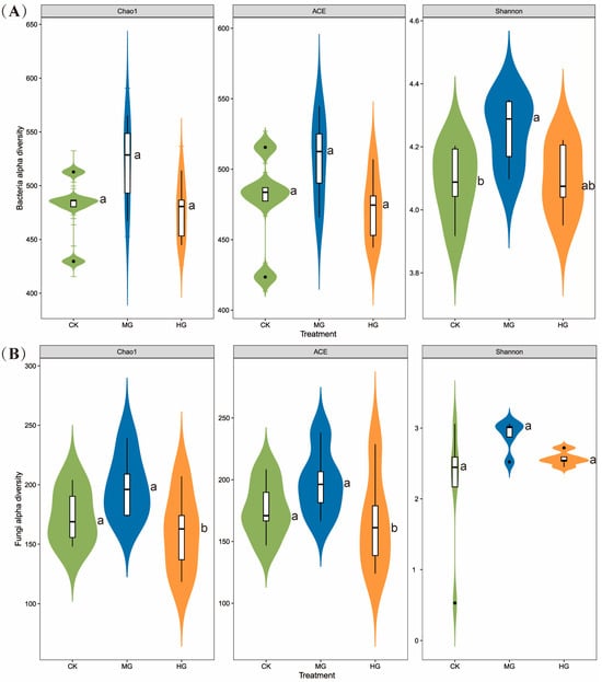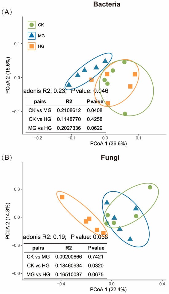 Compared to the CK, MG significantly altered the soil bacterial community structure (Figure 3A, p = 0.041), while HG and CK showed no difference (Figure 3A, p = 0.426). In contrast, HG significantly altered the soil fungal community structure compared to the CK (Figure 3B, p = 0.032). MG and HG showed a marginal difference (Figure 3B, p = 0.068). MG and CK did not significantly differ in the soil fungal community (Figure 3B, p = 0.742).