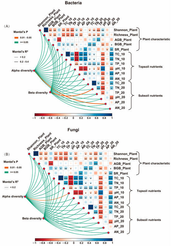 The Mantel test and correlation analysis of alpha and beta diversity of soil bacteria (A) and fungi (B) with plant diversity (Shannon diversity and richness) and soil nutrients (topsoil and subsoil). Shannon_Plant, Richness_Plant, AGB_Plant, and BGB_Plant indicate plant community Shannon diversity, richness, above-ground biomass, and below-ground biomass, respectively. Soil nutrients with ’_10’ and ‘_20’ indicate topsoil (0–10 cm soil depth) and subsoil (10–20 cm soil depth) nutrients, respectively. TC, soil total carbon; TN, soil total nitrogen; TP, soil total phosphorus; pH, soil pH; AP, soil available phosphorus; and AN, soil available nitrogen. The colored lines indicate the significance of the Mantel test results: orange, 0.01 < p < 0.05; green, p ≥ 0.05. Line thickness indicates correlation coefficient size. Asterisks indicate the significance effect: * p < 0.05, ** p < 0.01, *** p < 0.001.
