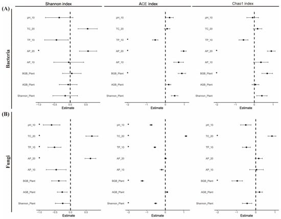 Linear mixed-effect model for controlling factors (Shannon index, above- and belowground biomass, and soil nutrients) of soil bacterial (A) and fungal (B) diversity indices. Shannon_Plant, AGB_Plant, and BGB_Plant indicate plant community Shannon diversity, above-ground biomass, and below-ground biomass, respectively. Soil nutrients with ‘_10’ and ‘_20’ indicate topsoil (0–10 cm soil depth) and subsoil (10–20 cm soil depth) nutrients, respectively. TC, soil total carbon; TP, soil total phosphorus; pH, soil pH; and AP, soil available phosphorus. Asterisks indicate the significance effect: * p < 0.05.