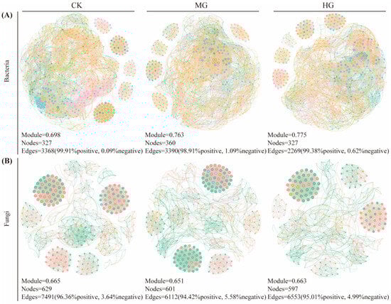 Co-occurrence network analysis of soil bacteria (A) and soil fungi (B) with relative abundance of OTUs greater than or equal to 0.1% under the different grazing intensities. The size of each node is proportional to the relative abundance of OTUs, and the colors of the nodes indicate different modularity classes. The edges indicate the significant Spearman correlations (|r| > 0.8 and p < 0.05). Null grazing, CK; moderate grazing, MG; and heavy grazing, HG.