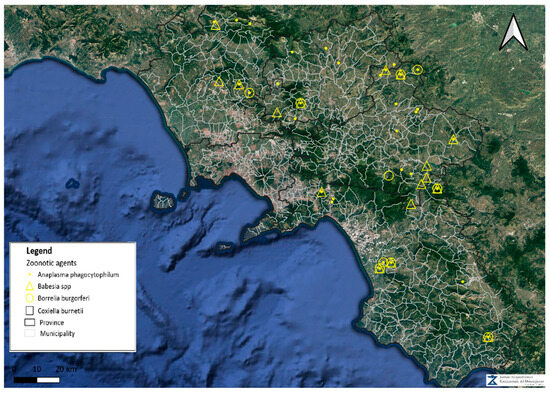 A total of 126 livestock establishments were investigated for the presence of TBPs. In particular, 121 (96%) were intended for housing sheep or goats, and 5 (4%) for cattle or buffaloes. Out of the 126 farms, 41 (32.5%, 95% CI: 25.0–41.1) tested positive for at least one TBP, being 36 (28.6%, 95% CI: 21.4–37.0) and 5 (3.9%, 95% CI: 1.7–8.9) from sheep/goat and cattle/buffalo establishments, respectively. The distribution of the tested positive farms of the study area, including all co-infection cases, is shown in Figure 1.