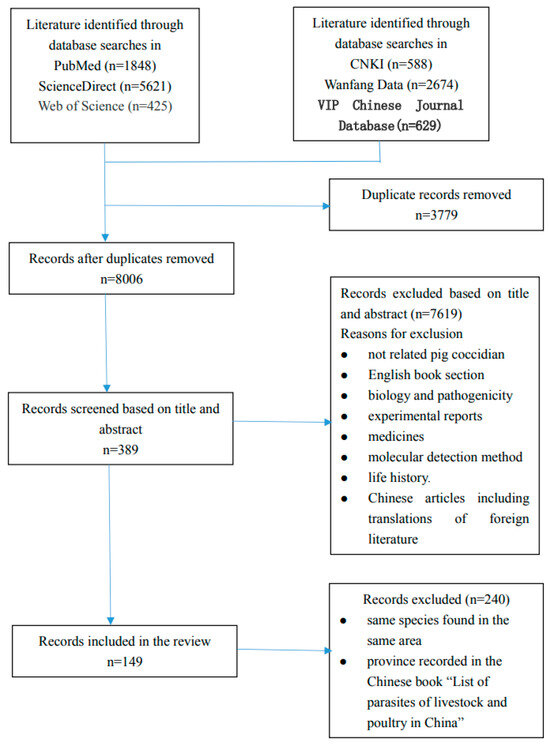 We obtained 11,785 papers, including articles, abstracts, and book sections, from the six electronic databases. After removing 3779 duplicates, 8006 were screened, and 389 papers including full texts and abstracts were eligible for selection based on the title and abstract relevance. We excluded a further 240 papers because they contained the same species found in the same area in different papers, or because the provinces were recorded in the Chinese book “List of parasites of livestock and poultry in China”. Finally, 149 articles met the inclusion criteria (Figure 1).