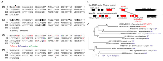 - Wang, Y.; Dang, X.; Ma, Q.; Liu, F.; Pan, G.; Li, T.; Zhou, Z. Characterization of a novel spore wall protein NbSWP16 with proline-rich tandem repeats from Nosema bombycis (microsporidia). Parasitology 2015, 142, 534–542. [Google Scholar] [CrossRef]