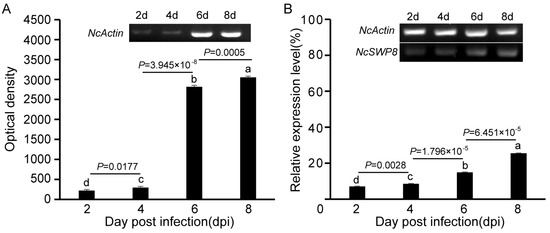 The NcSWP8 transcription was detected by PCR at various intervals following infection. The results in Figure 2A indicated that the amount of the NcActin gene gradually increased with the duration of infection. Amplified bands were observed from the second day, confirming that V. ceranae had successfully infected A. mellifera. The mean optical density (OD) values of the NcActin gene were 221, 295, 2791, and 3033 at 2, 4, 6, and 8 days post-infection (dpi), respectively. On the sixth day after infection, the optical density value of the NcActin gene significantly increased by approximately 10 times compared to the fourth day. The results indicated that the number of V. ceranae obviously increased from 4 dpi to 6 dpi. The successful infection of V. ceranae provided a prerequisite for the subsequent analysis of the expression profile of NcSWP8. Subsequently, the NcSWP8 transcription was detected by sqRT-PCR when the number of spores of V. ceranae was consistent. The results in Figure 2B showed that amplified bands were obviously detected from the second day. The relative expression levels of NcSWP8 were 7.1%, 8.6%, 14.9%, and 25.5% at 2, 4, 6, and 8 dpi, respectively, performing a gradual increase as the infection progressed. It suggested that the transcription of NcSWP8 could be clearly observed when the mature spores reached a certain quantity, and the expression level gradually increased with the duration of the infection.