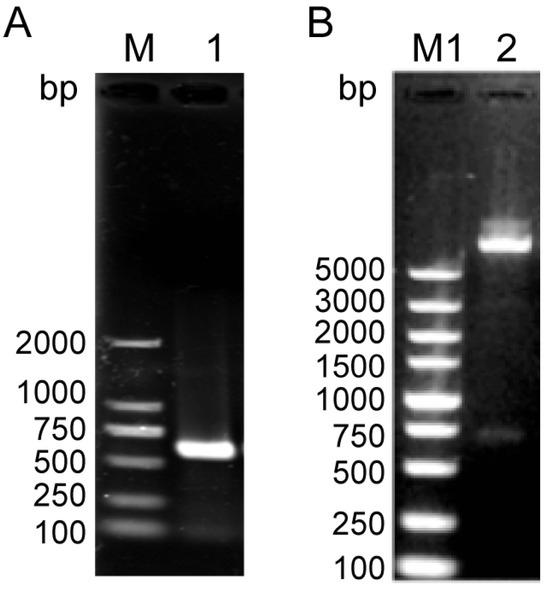 PCR (A) and enzyme digestion analysis (B) of the NcSWP8-pET30a recombinant plasmid. M: DL2000 Plus Marker; M1: DL5000 Plus Marker; 1: PCR product of NcSWP8-pET30a recombinant plasmid; 2: Double enzyme digestion product of NcSWP8-pET30a recombinant plasmid.