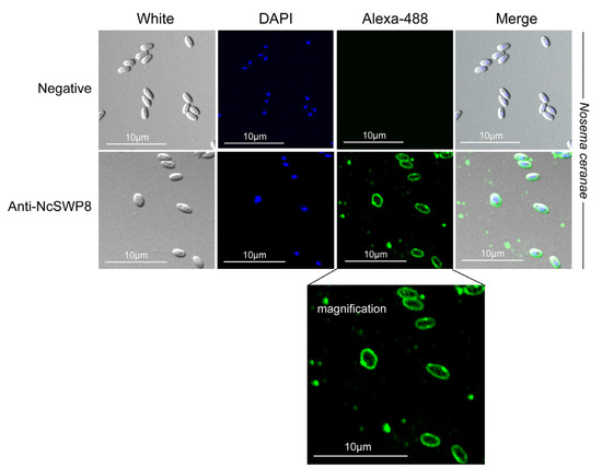 When Anti-NcSWP8 was utilized to conduct immunofluorescence analysis (IFA) with purified spores of V. ceranae, green fluorescence from the Alexa-488 dye indicated that NcSWP8 was distributed across the spore wall (Figure 6). The clear green fluorescence was also observed on the spore coat of V. ceranae (Figure A1). In the negative control group, no green fluorescence was observed (Figure 6), suggesting that the NcSWP8 protein was present on the spore surface, potentially serving as a spore wall protein of V. ceranae.