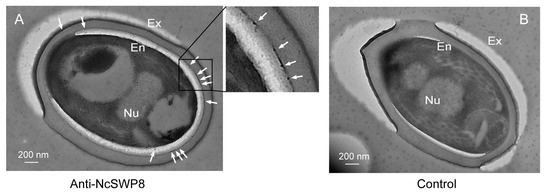 IEM localization of NcSWP8 in mature spores of V. ceranae. (A) Electron micrographs reveal the localization of NcSWP8. The immunogold particles were indicated with white arrows. (B) Negative control probed no signals. Abbreviations: Ex, exospore layer; En, endospore layer; Nu, nucleus.