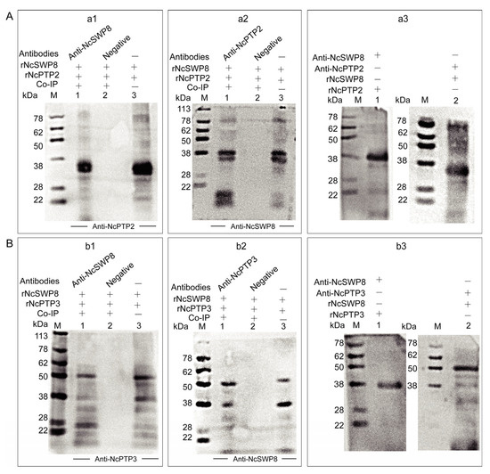 Protein–protein interaction analysis. (A) Interaction analysis of rNcPTP2 and rNcSWP8. (a1): NcPTP2, NcSWP8, and immunoprecipitated using Anti-NcPTP2 serum. M: protein marker; 1: Anti-NcPTP2 immunoprecipitation results; 2: negative serum immunoprecipitation results; 3: rNcSWP8; (a2): NcPTP2, NcSWP8, and immunoprecipitated using Anti-NcSWP8 serum. M: protein marker; 1: Anti-NcSWP8 immunoprecipitation results; 2: negative serum immunoprecipitation results; 3: rNcPTP2. (a3): Far-Western blot analysis of rNcSWP8 and rNcPTP2. M: protein marker; 1: rNcSWP8 (incubate the rNcPTP2); 2: rNcPTP2 (incubate the rNcSWP8); (B) Interaction analysis of rNcPTP3 and rNcSWP8. (b1): NcPTP3, NcSWP8, and immunoprecipitated using Anti-NcPTP3 serum. M: protein marker; 1: Anti-NcPTP3 immunoprecipitation results; 2: negative serum immunoprecipitation results; 3: rNcSWP8; (b2): NcPTP3, NcSWP8, and immunoprecipitated using Anti-NcSWP8 serum. M: protein marker; 1: Anti-NcSWP8 immunoprecipitation results; 2: negative serum immunoprecipitation results; 3: rNcPTP3. (b3): Far-Western blot analysis of rNcSWP8 and rNcPTP3. M: protein marker; 1: rNcSWP8 (incubate the rNcPTP3); 2: rNcPTP3 (incubate the rNcSWP8).