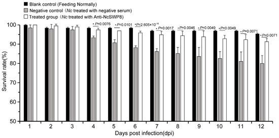Statistics on the survival rate of honeybees of the antibody-blocking experiment using Anti-NcSWP8. Data are the mean ± standard errors of three independent replicates, and the stars indicate significant differences between different groups (p < 0.05).