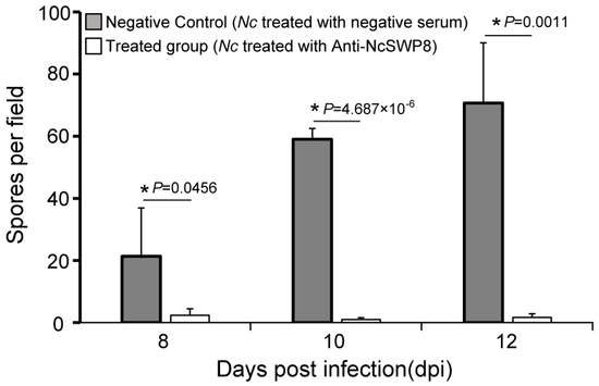 As illustrated in Figure 11, there was a significant difference in spore quantity among the two groups: those fed V. ceranae treated with negative serum and those fed V. ceranae treated with Anti-NcSWP8. In the middle and late stages of bee infection, the number of mature spores in the Anti-NcSWP8-treated group was lower, showing a significant difference from the negative control group. The results indicated that the NcSWP8 on the V. ceranae surface was blocked by the antibody, leading to a significant reduction in its pathogenicity and infection capability, suggesting that the NcSWP8 may play a crucial role in the host infection process of V. ceranae.