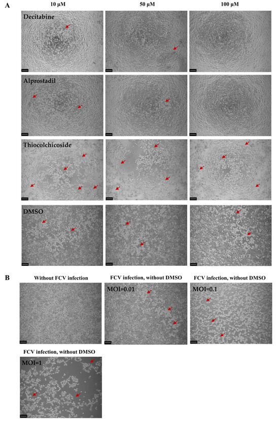 Primary screening of antiviral natural products against feline calicivirus. (A) Indicates the bright-field observation of FCV-induced CPE (MOI = 0.01) in CRFK cells, which were treated with different concentrations of natural products, including decitabine, alprostadil, tubercidin, thiocolchicoside, and DMSO, respectively. DMSO was used as the non-antiviral effect control with FCV infection. Scale bar, 100 μM. (B) Indicates the mock group, including no FCV infection and FCV infection without DMSO treatment. Scale bar, 100 μM. Red arrow indicates the CPE sites.