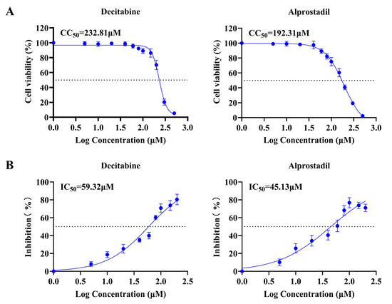 Evaluation of cytotoxicity and antiviral efficacy of natural products in vitro. (A) The CC50 values of decitabine and alprostadil were conducted. (B) The IC50 values of decitabine and alprostadil were evaluated.