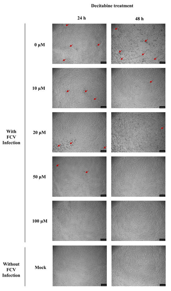 The FCV-induced CPE observation to confirm the antiviral effect with different times and concentrations of decitabine treatment. Red arrow indicates the CPE sites. Scale bar, 250 μM.