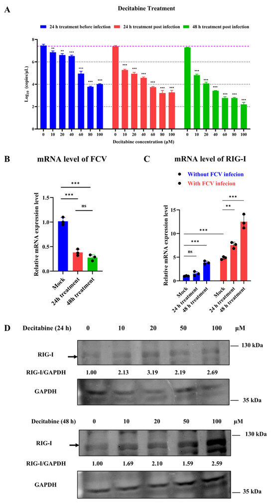 Investigation of the potential antiviral role of decitabine against feline calicivirus. (A) The extracellular FCV RNA of CRFK cells under decitabine treatment was evaluated. (B) The intracellular FCV RNA of CRFK cells treated with decitabine was extracted, and the relative level was determined. (C) The relative level of the feline RIG-I gene in CRFK cells under decitabine treatment with and without FCV infection was determined. Samples were analyzed by qRT-PCR in three independent experiments. (ns indicated no significance, ** p < 0.01, *** p < 0.001) (D) The protein expression of feline RIG-I in CRFK cells treated with different concentrations of decitabine was determined.