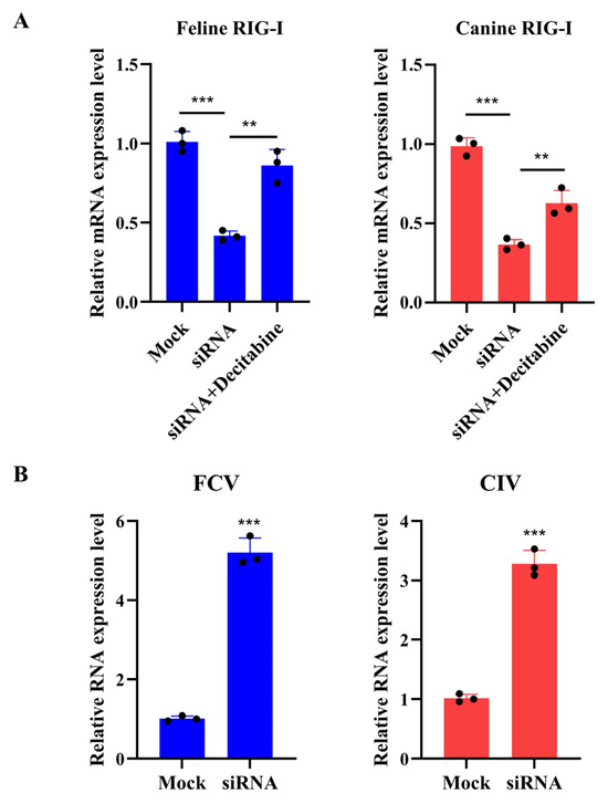 Further validation of the antiviral effect of RIG-I against feline calicivirus and canine influenza virus. (A) Cells were transfected with siRNA for feline and canine RIG-I gene for 24 h, and one of the RNA interference groups was treated with 100 μM decitabine after transfection. The relative level of the RIG-I gene in cells was detected. (B) Cells were transfected with siRNA for feline and canine RIG-I gene for 24 h, and cells were infected with FCV and CIV for 24 h post 24 h transfection, respectively. The relative levels of FCV and CIV were detected, respectively. (A,B) Samples were analyzed by qRT-PCR in three independent experiments. (** p < 0.01, *** p < 0.001).