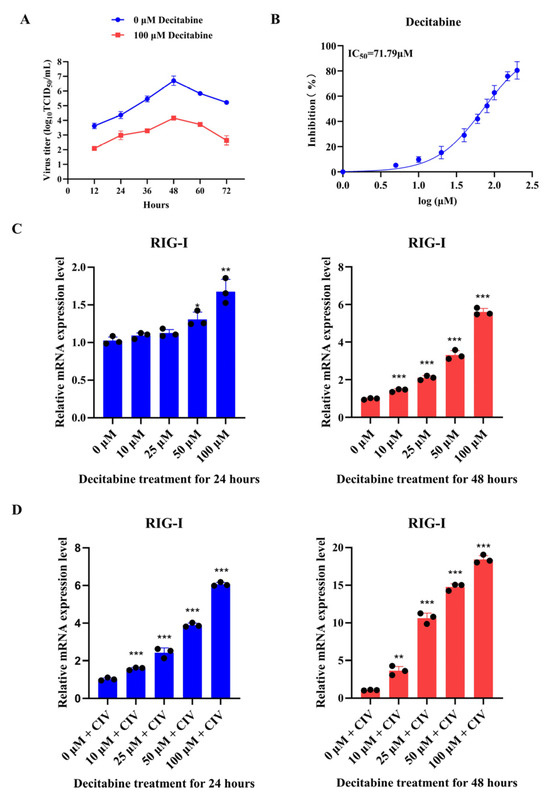 Investigation of potential antiviral role of decitabine against canine influenza virus. (A) CIV growth kinetics were evaluated in MDCK cells treated with 100 μM decitabine. (B) The IC50 of decitabine against CIV was determined. (C) The relative level of the canine RIG-I gene in MDCK cells was treated at different times and concentrations of decitabine without CIV infection. (D) The relative level of the canine RIG-I gene in MDCK cells was treated at different times and concentrations of decitabine with CIV infection. (C,D) Samples were analyzed by qRT-PCR in three independent experiments. (* p < 0.05, ** p < 0.01, *** p < 0.001).