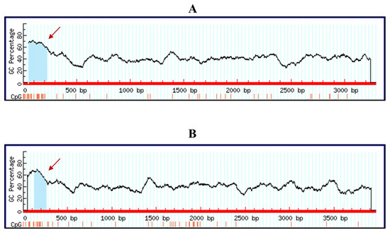 Bioinformatic analysis of the CpG island of canine and feline RIG-I gene. (A) indicated the analysis for canine RIG-I gene. (B) indicated the analysis for feline RIG-I gene. The red arrow indicates the CpG island.