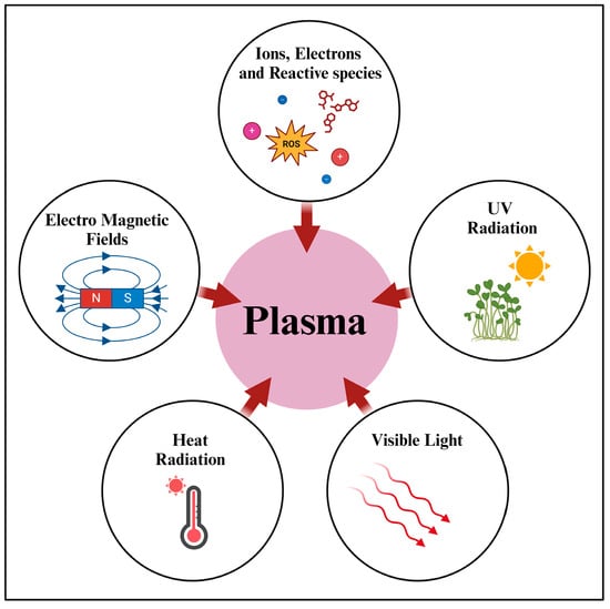 Plasma technology has emerged as a promising tool in agricultural research and applications, offering innovative solutions in a broad spectrum of areas to enhance crop productivity, improve food safety, and promote sustainable farming practices. Plasma features a mix of electrons, ions, and neutral species capable of inducing significant chemical and physical changes in treated materials through complex interactions (Figure 1) []. Agricultural plasma treatments generate reactive species like hydroxyl radicals, atomic oxygen, ozone, and nitrogen oxides. These species can damage cellular components through oxidative mechanisms, such as lipid peroxidation and protein oxidation []. Plasma systems used in research can be broadly classified into two main categories: thermal plasma (TP) and NTP systems. TP systems are exemplified by extremely high temperatures, characteristically surpassing 10,000 °C. In thermal plasma, all particles are in a thermal steady state. While effective for certain industrial processes, thermal plasma has a confined scope in phytological research due to its potential to cause thermal damage to heat-sensitive plant materials. NTP, otherwise known as cold atmospheric plasma (CAP) or low-temperature plasma (LTP), operating at or near room temperature, is highly advantageous for botanical research []. The largest concentration of research and development is found in the Asia-Pacific region, particularly in Japan, China, and South Korea, accounting for approximately 45% of global plasma agriculture research activities []. The global market for agricultural plasma technologies is estimated at 100–150 million USD, with an annual growth rate of 15–20% [,]. The technology’s applications are distributed across seed treatment (40%), post-harvest processing (30%), soil treatment (20%), and water treatment (10%), with ongoing research focused on optimizing these processes for commercial viability [].