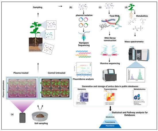 Illustration of the plasma optimization of environmental soil samples followed by (a) the sampling of treated and control samples, (b) the isolation of plasmidome from the microbial sample, (c) the transcriptome profiling to quantify the differentials expression, and (d) metabolite isolation and profiling, followed by an interactome study combining plasmidome, transcriptome, and metabolome data.