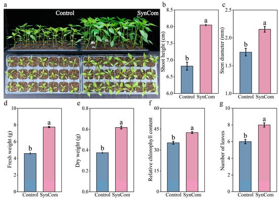 Effect of SynCom inoculation on pepper seeding growth. (a) Pepper seeding growth on the seeding substrate under SynCom inoculation after 45 days cultivation. (b) Effect of SynCom inoculation on shoot height of pepper plants. (c) Effect of SynCom inoculation on stem diameter of pepper plants. (d) Effect of SynCom inoculation on fresh weight of pepper plants. (e) Effect of SynCom inoculation on dry weight of pepper plants. (f) Effect of SynCom inoculation on chlorophyll content of pepper plants. (g) Effect of SynCom inoculation on the number of leaves. SynCom represents synthetic microbial community inoculation. Different letters indicate significant differences at p < 0.05 between SynCom inoculation and the control treatment.