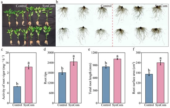 Effect of SynCom inoculation on pepper root morphology. (a) Effect of SynCom inoculation on root growth and development in the seedling substrate. (b) Effect of SynCom inoculation on root growth and development using a root scanner. (c) Effect of SynCom inoculation on the activity of root vigor in pepper plants. (d) Effect of SynCom inoculation on root tips in pepper plants. (e) Effect of SynCom inoculation on the total root length of pepper plants. (f) Effect of SynCom inoculation on the root surface area of pepper plants. SynCom represents synthetic microbial community inoculation. Different letters indicate significant differences at p < 0.05 between SynCom inoculation and the control treatment.
