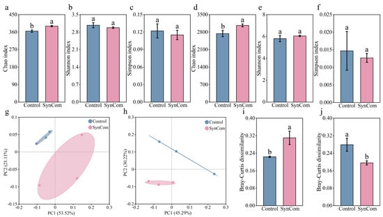 Effect of SynCom inoculation on the diversity of the rhizosphere microbial community. (a) Fungal Chao index for the two treatments. (b) Fungal Shannon index for the two treatments. (c) Fungal Simpson index for the two treatments. (d) Bacterial Chao index for the two treatments. (e) Bacterial Shannon index for the two treatments. (f) Bacterial Simpson index for the two treatments. (g) Beta diversity of the rhizosphere fungal community using PCoA principal component analysis. (h) Beta diversity of the rhizosphere bacterial community using PCoA principal component analysis. (i) Bray–Curtis dissimilarity of the rhizosphere fungal community. (j) Bray–Curtis dissimilarity of the rhizosphere bacterial community. SynCom represents synthetic microbial community inoculation. Different letters indicate significant differences at p < 0.05 between SynCom inoculation and the control treatment.