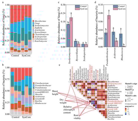 Effect of SynCom inoculation on the composition of the diversity of the rhizosphere microbial community. (a) Effect of SynCom on the composition of the fungal community at the genera level. (b) Effect of SynCom inoculation on the composition of the bacterial community at the genera level. (c) The relative abundance of significant differences in fungal at the genus level for the treatments. (d) The relative abundance of significant differences in bacterial genus for the treatments. (e) Correlation analysis between significant differences in species of microbial community composition and the growth and development of pepper for the two treatments. SynCom represents synthetic microbial community inoculation. Different letters indicate significant differences at p < 0.05 between SynCom inoculation and the control treatment.