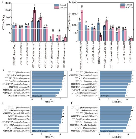 The contribution of microbial community characteristics to the growth and development of pepper seeding. (a) Relative abundance of fungal significant differences in OTUs for the two treatments. (b) Relative abundance of bacterial significant differences in OTUs for the two treatments. (c) Relative importance of significant OTUs in the microbial community on shoot height of pepper. (d) Relative importance of significant OTUs in the microbial community on dry weight of pepper. (e) Relative importance of significant OTUs in the microbial community on chlorophyll content of pepper. (f) Relative importance of significant OTUs in the microbial community on activity of root vigor. SynCom represents synthetic microbial community inoculation. Different letters indicate significant differences at p < 0.05 between SynCom inoculation and the control treatment. “*” indicated significant importance at p < 0.05, and “**” indicated significant importance at p < 0.01, between the SynCom inoculation and control.