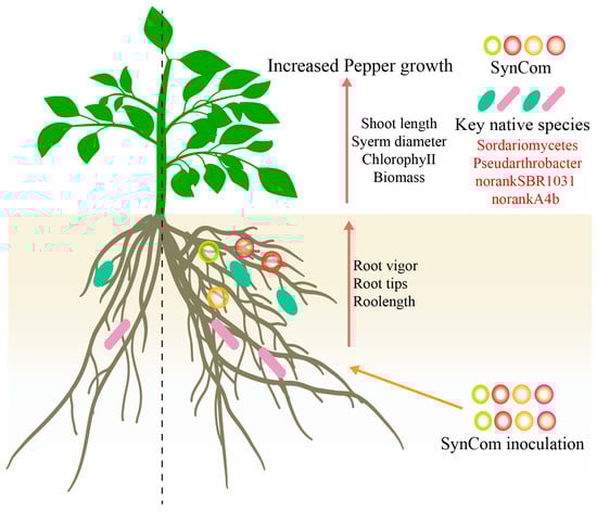 The present study showed that the relationship between pepper growth and root morphology was predominantly influenced by changes in rhizophore microbial community diversity and composition. SynCom induced the alteration of microbial community composition and diversity, which could partly explain the promotion of pepper growth in the current study. The changed rhizosphere community composition, diversity, and stability under SynCom conditions contributed to increased pepper growth and regulated the root morphology, which implied that the assembled rhizosphere microbial community play an important role in pepper growth. Specifically, the key native microbes, such as Scedosporium, Sordariomycetes, Pseudarthrobacter, norank SBR1031, and norank A4b may be pivotal in forming a distinctive rhizosphere microbial community by occupying the ecological niche, altering native microbes, and increasing microbial networks [47,48]. Sordariomycetes improve nutrient uptake via beneficial mycorrhizal associations, decompose organic matter to release essential nutrients, suppress diseases through secondary metabolites, and enhance stress tolerance by improving soil water retention. Pseudarthrobacter contributes by producing phytohormones that stimulate growth, solubilizing minerals to increase nutrient availability, fostering beneficial microbial interactions, and suppressing soil-borne pathogens. Together, these taxa create a synergistic environment in the rhizosphere, promoting nutrient cycling, disease resistance, and overall soil health, which is vital for sustainable agricultural productivity. Trivedi et al. reported that the application of SynCom inoculation can attract and enrich native beneficial microorganisms with growth-promoting functions and legacy effects, which could modulate the rhizosphere microbiome structure, fostering a potent microbial community with mutual promotional effects that collectively support plant growth and resistance [25]. The inoculation of Proteobacteria, Actinobacteria, Firmicutes, Chloroflexia, and Zygomycota increased the fungal community composition and diversity, and significantly enriched the proportion of saprophytic trophic fungi, with Aspergillus OTU3 identified as a key species in community assembly to promote plant growth by exhibiting a “synergistic effect” during the establishment of healthy soil [49,50]. It has been found that the combination of microbial communities can stimulate similar indigenous beneficial microbial communities and foster biofilm formation, secreting antioxidant proteins, glycosyl hydrolase family enzymes, β-glucosidase, expansion-like proteins, chitinase, and secondary metabolism proteins, and enhancing rhizosphere colonization [51]. Accordingly, SynCom inoculation can lead to microbial communities as observed in the current study. In addition, SynCom inoculation may play multiple roles to stimulate pepper growth, including assembling rhizosphere microbial communities, accelerating root vigor, and increasing root tips, thereby benefitting nutrient absorption and physiological metabolism [52]. These findings collectively suggest that the rhizosphere microbial community plays a promising role in driving plant development [53]. In terms of the current study, SynCom inoculation selectively promoted rhizosphere microbial community assembly and enriched the key taxa including Scedosporium, Sordariomycetes, Pseudarthrobacter, norankSBR1031, and norankA4b for pepper growth, which provide mechanistic insights into how the rhizosphere microbiome can be harnessed to regulate the growth and diversity of native microbes in the plant rhizosphere, thereby effectively promoting plant growth. In the future, we will delve deeper into examining the direct and indirect effects of key species on chili pepper growth. Exploring how these species influence microbial communities and their functions warrants further research, as it can offer specific support for targeted microbial selection. Additionally, inoculating synthetic microbial communities (SynComs) into field conditions encounters challenges due to environmental variability, including variations in soil types, climate factors, and plant interactions. Soil composition, such as texture and nutrient availability, influences microbial viability, while native microbial communities may compete with, or aid introduced strains. Fluctuations in temperature and moisture influence microbial activity, underscoring the importance of timing for application.