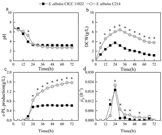 To evaluate the fermentation performances, comparisons of pH, DCW, ε-PL production, and the average specific ε-PL formation rate () were made in shake-flask fermentation between the original strain of S. albulus CICC 11022 and the evolved high-producing strain of S. albulus C214. The pH values of both strains initially decreased and subsequently stabilized, in accordance with our previous study []. However, it is worth noting that while the pH of S. albulus CICC 11022 decreased to approximately 3.2, that of S. albulus C214 dropped to about 2.7 (Figure 2a). Notably, cell growth and ε-PL production were significantly enhanced in the mutant when compared with the original strain. The DCW and ε-PL production values of S. albulus C214 reached their maximum at 3.78 and 1.57 g/L, which were 234.51% and 153.23% higher than those of S. albulus CICC 11022 (Figure 2b,c). It should be noted that when the environmental pH fell below 3.2, both strains experienced extreme acid stress, leading to reduced DCW as well as slowed or even ceased ε-PL production []. The values of both strains initially increased, then decreased, and eventually stabilized (Figure 2d). Before 18 h, the of S. albulus CICC 11022 was higher than that of S. albulus C214. This can be attributed to the fact that the pH of S. albulus C214 (about 5.5 at 18 h) was not conducive for ε-PL production, whereas the pH of S. albulus CICC 11022 had already decreased to a suitable level (about 4.0 at 18 h) for ε-PL production. However, after 18 h, the of S. albulus C214 consistently exceeded that of S. albulus CICC 11022, indicating that the ε-PL production capability of individual cells was also enhanced after ALE. Among these effects observed under acid stress conditions, it was evident that the impact of acid stress on the original strain was significantly greater than that on the evolved strain, which means that the mutant obtained higher acid resistance after ALE.