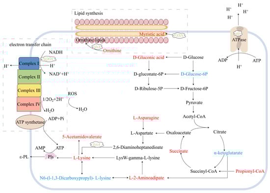 Simplified metabolic network for ε-PL production by S. albulus. The metabolites denoted by red represent upregulation, while those denoted by blue represent downregulation. Genetic mutations are represented by yellow.