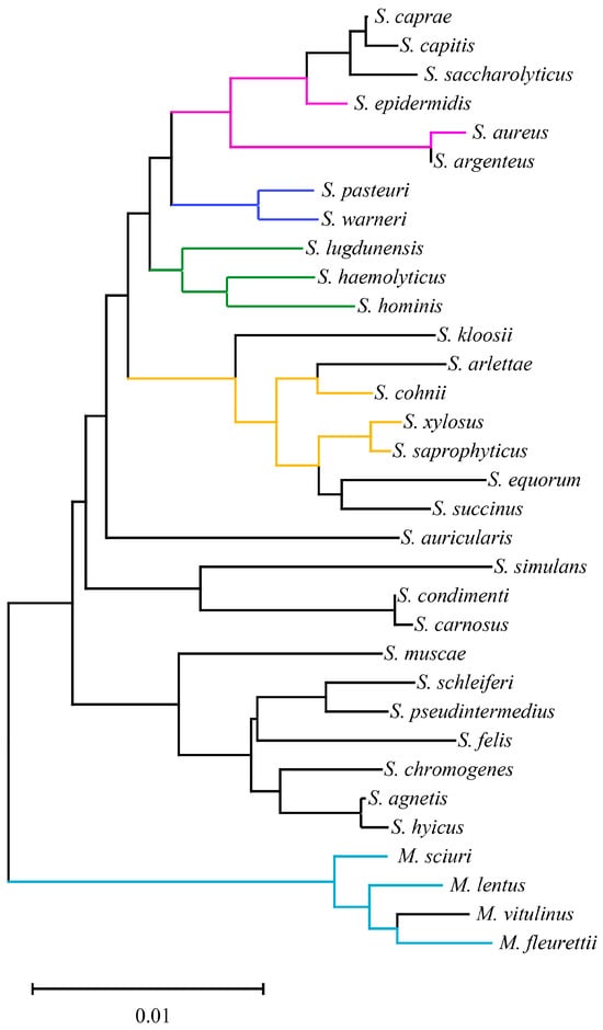 As shown in Figure 1, the clade length remained within the range of 0–0.02 for 33 staphylococci species. Notably, according to previous research [], the reassigned M. sciuri, Mammaliicoccus lentus, M. vitulinus and M. fleurettii exhibited greater taxonomic distances from other staphylococci species. Interestingly, the current emerging methicillin-resistant staphylococci species generally showed close taxonomic relationships as opposed to random distribution within the staphylococci genus. For instance, according to previous reports involving MR-CoNS investigations in animals, the emergence of MR-CoNS disseminated within Staphylococcus cohnii, Staphylococcus epidermidis, Staphylococcus haemolyticus, M. sciuri, Staphylococcus warneri, Staphylococcus xylosus, M. lentus, Staphylococcus lugdunensis, Staphylococcus hominis, Staphylococcus saprophyticus, M. fleurettii, and Staphylococcus pasteuri [,,,,,,]. This could explain the greater prevalence of these CoNS in animal-origin environments and increase the likelihood of MR-CoNS emergence.