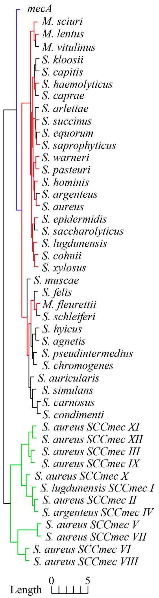 Secondly, since the initial designation of SCCmec composed of mecA and cassette chromosome recombinase ccrAB [], the evolutionary analysis of methicillin resistance genetic determinants has been largely dependent on SCCmec structural comparison. For instance, based on the common presence of M. vitulinus, M. fleurettii and M. sciuri originating from mammals, through a sequence identity comparison of multiple serial Open Reading Frames (ORFs) within SCCmec, M. fleurettii was proposed as the evolutionary origin of SCCmec []. In addition, the evolutionary steps of SCCmec were hypothesized among M. vitulinus, M. fleurettii and M. sciuri; it was found that M. vitulinus and M. fleurettii constitute the mec complex, and M. sciuri is the precursor of SCCmec [].