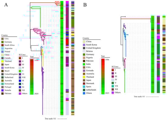 Phylogenic relationship of 213 ccrAB/C corresponding to yearly, geographical, and SCCmec-type characteristics. (A,B) represent ccrAB and ccrC, respectively. The color strips in turn represent collection years, SCCmec types, and geographical locations from left to right.