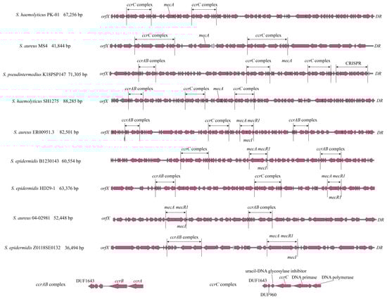 As mentioned above, there are multiple forms of ccrAB/C (e.g., ccrAB-ccrC, ccrC-ccrC, ccrAB-ccrAB-ccrC, ccrAB-ccrC-ccrC) close to mecA in 35 strains with complete or incomplete SCCmec structures. This could explain the low identity or ambiguous outputs observed using SCCmecFinder, resulting in the presence of unexpected SCCmec types in phylogenetic trees. As shown in Figure 4, nine representative strains were selected to demonstrate these phenomena. S. haemolyticus PK-01 and S. aureus MS4 exhibit ccrC-ccrC and a complete SCCmec structure; S. pseudintermedius K18PSP147 and S. haemolyticus SH1275 exhibit ccrAB-ccrC-ccrC and a complete SCCmec structure, whereas all four strains exhibit a loss of mecR1 and mecI in the mecA complex. S. aureus ER00951.3 exhibits ccrAB-ccrC-ccrAB and complete SCCmec structure with a complete mecA complex. S. epidermidis B1230143 and S. epidermidis HD29-1 exhibit ccrAB-ccrC and an incomplete SCCmec structure with a complete mecA complex. S. aureus 04-02981 and S. epidermidis Z0118SE0132 were introduced as regular SCCmec types that exhibit ccrAB and ccrC with a complete mecA complex, respectively. The ccrAB and ccrC complexes in these nine strains have the same ORF structures. Regarding the distant geographical locus and collection years of these nine strains, it is suggested that there may have been a fixed transmission model for ccrAB and ccrC complexes compared with the mecA complex. The excision and reintegration of ccrAB/C might be more complicated than previously believed (i.e., these processes may involve targeting upstream and downstream DRs of SCCmec).