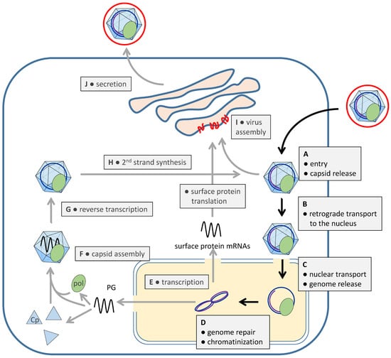 Capsids contain different nucleic acids. Empty capsids—although unspecific nucleic acid packaging cannot always be excluded—are observed in virions, in the cytoplasm, and in the nucleus [64,65]. PG-containing capsids are cytoplasmic; rcDNA- and dslDNA-containing capsids are found in the virion and in the cytoplasm [64], the latter only in marginal amounts upon initial hepatocyte infection.