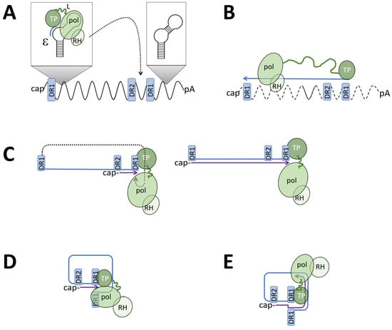 HBV genome maturation. PG: black wave line; minus-strand DNA: blue line; plus-strand DNA: violet line. TP: terminal protein (=pol priming domain); pol: catalytic pol domain; RH: pol RNase H domain. The linker between TP and the catalytic domain is shown as a green line of variable length. DR1: direct repeat 1 present in 2 copies on the PG. DR2: direct repeat 2. (A) Pol binds to e and synthesizes the first nucleotides, causing a covalent link to the TP of pol. This complex translocates to DR1. (B) Pol synthesizes the minus-strand DNA until the 5′ end of the PG, which has the DR1 sequence. Synthesis is combined with degrading the RNA from the RNA–DNA hybrid. The first 11–16 nucleotides of the RP (including cap) stay non-degraded. (C) left: The RNA fragment translocates to DR2 upstream of DR1, where pol initiates plus-strand DNA synthesis. Right: the RNA primer translocation does not occur (approx. in 10%) and pol synthesizes the plus-strand DNA, resulting in dslDNA. (D) When reaching the end of the minus-strand DNA, the 5′ end of the plus strand anneals to the complementary DR1 on the 5′ end of the minus-strand DNA. (E) Pol continues with plus-strand DNA synthesis, creating a circular form of the genomes (rcDNA). The plus-strand DNA stays incomplete.