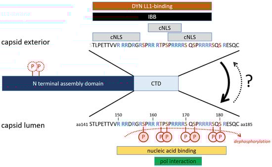 The four arginine clusters in the CTD do not represent the typical cNLS, which is composed of similarly charged lysine residues. Nonetheless, they act as three bi-partite, overlapping NLS, which was shown by fusing them to BSA or by their potential to compete for the nuclear import of other cNLS-bearing cargo (aa142–155, aa158–168, aa165–175) [41,49,50,132,133]. Phosphorylation between the arginine clusters diminishes the importin α interaction, at least of the overlapping cNLS. Further, the exposure of the entire CTD enables direct importin β1 binding, replacing importin α binding due to the higher affinity of importin β1. Similar to importin α binding, the interaction of the CTD with importin β1 is reduced by CTD phosphorylation, as shown by using E. coli-expressed, in vitro-reassembled capsids that are SPRK-1-phosphorylated [74].