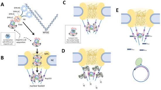 HBV enters hepatocytes by clathrin-dependent endocytosis after interactions with heparan sulfate and the HBV-specific receptor NTCP, as shown for NTCP-expressing HepG2 cells [12,13]. Membrane penetration seems to occur in the late endosome either through fusion or membrane permeabilization [14,15,16]. The capsid is released into the cytoplasm (Figure 1 (A)), followed by the transport of the viral genome through the cytoplasm (Figure 1 (B)) and across the nuclear envelope (NE) (for a review, see [5]). Hepatocytes have a long lifespan of at least 200–400 days [17,18], and entry of the rcDNA into the nucleus can thus not occur by passive inclusion into the nucleus during mitosis. Instead, HBV, like most other viruses with a nuclear phase, had to develop a strategy of passing the intact NE (Figure 1 (C)).