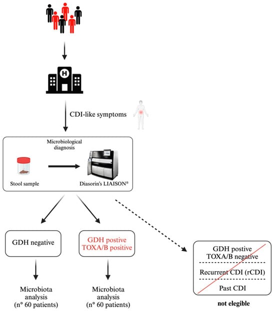 Adult patients (age > 18 years old) hospitalized at the Fondazione Policlinico Universitario Agostino Gemelli IRCCS who showed gastrointestinal symptoms and were suspected of CDI or required microbiota investigation were considered eligible for this study. One hundred and twenty patients were recruited and equally stratified into two groups based on C. difficile Glutamate Dehydrogenase (GDH) and toxin A/B (TOX A/B) detection using a Chemiluminescence Immunoassay (CLIA) (the Liaison system—DiaSorin Spa, Saluggia VC, Italy). According to the international guidelines, the laboratory examination was carried out only on unformed diarrheal stools, and a positive test was defined as the detection of both targets []. Patients previously diagnosed with CDI, with recurrent CDI, and positive for GDH but negative for TOXs A/B were excluded.