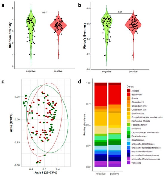 At the onset of CDI, there were no differences in the alpha diversity metrics between the C. difficile-positive patients and the CDI-negative individuals. Indeed, no changes were detected in either the number of species which composed the gut’s microbial community or in the prevalence of certain species. As reported in the beta diversity analysis, the absence of a discernible separation between these two groups was aligned with earlier findings reported in the literature [,].