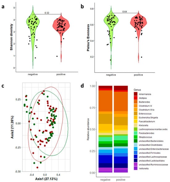 To measure the alpha diversity, we used the final dataset to calculate the Shannon index and Pielou’s evenness. Statistical significance was assessed by using the Wilcoxon signed rank test. To measure the beta diversity, we used the final dataset to generate a Bray–Curtis distance matrix (at the taxon level), which was then represented using a principal coordinate analysis (PCoA). Statistical significance was assessed using the vegan package’s (v2.6-4) adonis function, which performs a permutational multivariate analysis of variance (PERMANOVA). Relative abundance was finally computed at the phylum and genus levels, and statistical significance was assessed using the Wilcoxon signed rank test [].