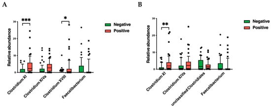 Evaluation of the relative abundance of the genera Clostridium XI, Clostridium XIVa, Clostridium XVIII, and Faecalibacterium in CDI-positive and CDI-negative patients using microbiota solution A (A) and microbiota solution B (B). Data are reported for each sample together with a box plot with organization according to Tukey’s method. (*, p < 0.05; **, p < 0.01; ***, p < 0.001).