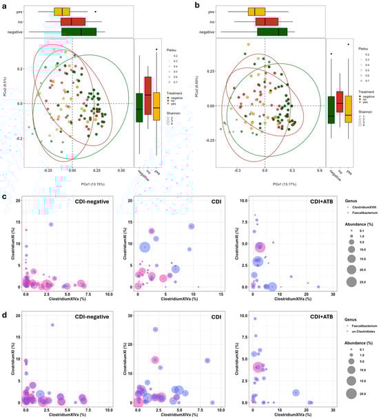 Impact of the antibiotic treatment on the gut microbiota of patients with or without CDI by sequencing the V1-V3 (sol.A, (a)) and V3-V4 and V6 (sol.B, (b)) 16S RNA hypervariable regions. Beta diversity, evaluated by using the Bray–Curtis distance and graphically represented using a principal coordinate analysis (PCoA), was reported (in green, CDI-negative samples; in red and gold, CDI samples or CDI samples of patients who had been administered the antibiotic treatment, respectively). Size and color opacity are used to depict the Shannon diversity index and Pielou’s evenness. Bubble plot graphs (sol.A and sol.B: (c) and (d), respectively) report the relative abundance of the genera Clostridium XI (y-axis) and Clostridium XIVa (x-axis), Faecalibacterium, and Clostridium XVIII (sol.A) or unclassified Clostridiales (sol.B).