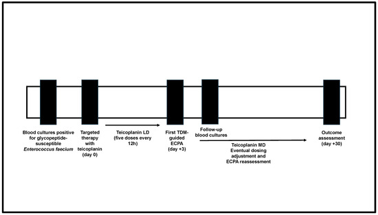This retrospective cohort study was carried out at the IRCCS Azienda Ospedaliero-Universitaria of Bologna, Italy. It included adult hospitalized patients having, in the period 1 March 2021–31 October 2024, a documented BSI caused by glycopeptide-susceptible Enterococcus faecium being treated with teicoplanin as definitive targeted therapy optimized by means of a real-time TDM-guided expert clinical pharmacological advice (ECPA) program. Only patients who underwent follow-up blood cultures after at least 48 h of targeted therapy with teicoplanin were included. Patients either not having follow-up blood cultures or having follow-up blood cultures in the first 48 h were excluded because the microbiological outcome could not be correctly assessed. Also, patients with polymicrobial BSI were excluded. A summary of the study design is reported in Figure 1. The study was approved by the local ethical committee (n. 442/2021/Oss/AOUBo approved on 28 June 2021) and conducted in agreement with the guidelines of the Declaration of Helsinki.