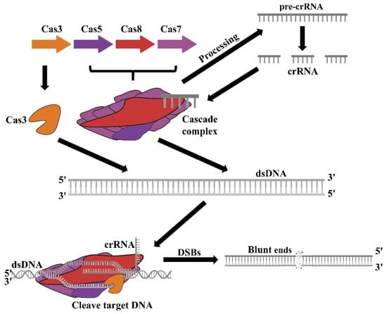 - Yang, J.; Li, X.; He, Q.; Wang, X.; Tang, J.; Wang, T.; Zhang, Y.; Yu, F.; Zhang, S.; Liu, Z.; et al. Structural Basis for the Activity of the Type VII CRISPR-Cas System. Nature 2024, 633, 465–472. [Google Scholar] [CrossRef] [PubMed]