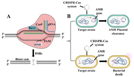 Schematic illustration of CRISPR/Cas9 system action mechanisms. (A) The programmed gRNA binds to the Cas9 protein, activating it and transforming it from its inactive to active form. Once activated, Cas9 searches for its target sequence by locating a matching PAM sequence (5′-NGG-3′). Upon identification, Cas9 induces double-strand breaks (DSBs) at three base pairs upstream of the PAM, utilizing its HNH and RuvC domains; (B) The outcome of the system is influenced by the location of the target Antimicrobial-resistance (AMR) gene. Cleavage of chromosomal sequences by CRISPR/Cas can result in the death of the targeted bacteria, whereas targeting a sequence on a plasmid can lead to the loss of the plasmid from the host cell.