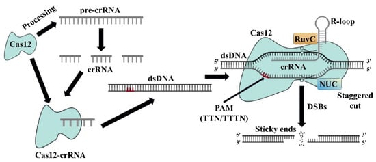 Schematic representation of the CRISPR/Cas12 system. The Cas12 protein requires only crRNA to induce double-strand breaks (DSBs). Cas12 cleaves the target region adjacent to a PAM sequence (TTN/TTTN) using its RuvC and nuclease lobe (NUC) domains. When Cas12 encounters its target, it begins the formation of an R-loop, establishing base–pair hybridization between the crRNA and the target DNA strand. During this process, Cas12 aligns with approximately 17 bp of the target sequence, leading to R-loop formation. Once the R-loop is established, the Cas12 protein utilizes its active RuvC domain to create a staggered cut in the non-target strand, guided by the PAM sequence.