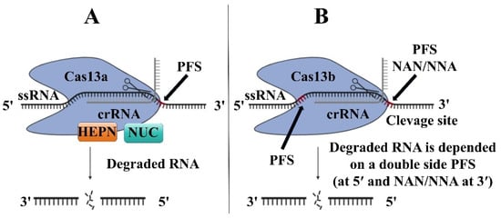 The Cas13 protein family contains two subtypes: (1) Cas13a, which comes from the Leptotrichia shahii bacterium (LshCas13a), officially named C2c2, and belongs to the type VI CRISPR/Cas system; (2) Cas13b, which comes from Prevotella sp. (PspCas13b) belongs to the type III CRISPR/Cas system. The system only targets and cuts single-stranded RNA(ssRNA), not single-stranded DNA(ssDNA) or double-stranded DNA(dsDNA) [61]. The Cas13a protein is activated by a single crRNA, following a similar activation mechanism to the processing of the Cas12 protein. Cas13a proteins include crRNA, NUC lobes, and two higher eukaryotes and prokaryotes nucleotide-binding (HEPN) RNase domains for targeting RNA (Figure 5A) [62]. The Cas13b protein is more precise than the Cas13a protein because the protospacerfanking site (PFS) targets RNA of A, U, or G at the 5′ end, and targets PAM at the 3′ end, and the transcript source is determined by the sequence at the 3′ end of the RNA target site (called PFS) [63]. The Cas13b protein is associated with mature crRNA. The CRISPR/Cas13b complex searches for the target ssRNA and induces conformational changes in the ssRNA target, leading to non-specific RNA cleavage (Figure 5B) [64].